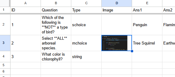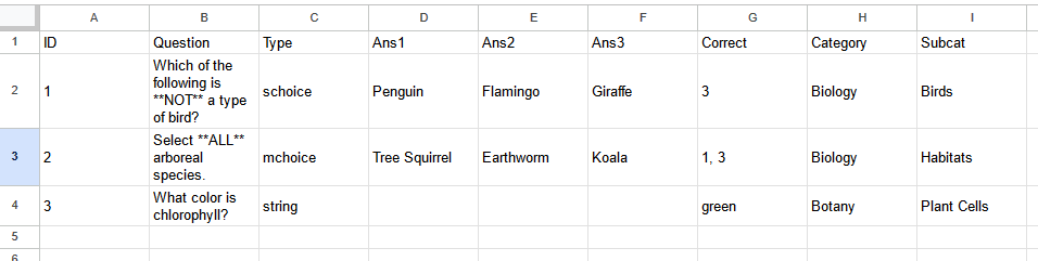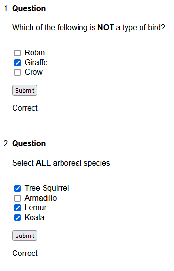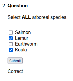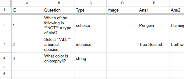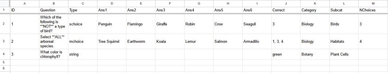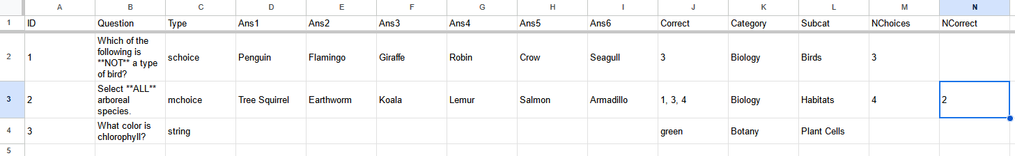 In a similar vein to the NChoices column is the “NCorrect” column, which specifies how many of the options are correct answers. This column can only be used for mchoice questions.