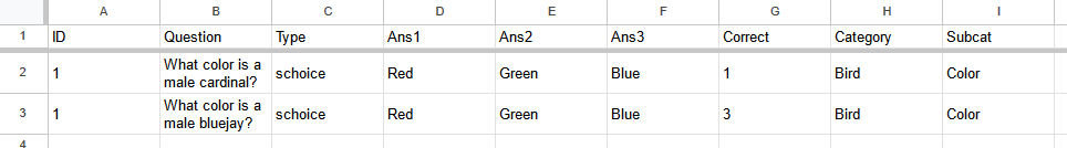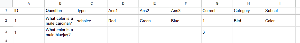 It can be useful to group multiple versions of the same question into one .Rmd file. This can be easily done in the spreadsheet by giving multiple rows the same value in the “ID” column. Here, we create two questions that are both related to the feather colors of bird species.