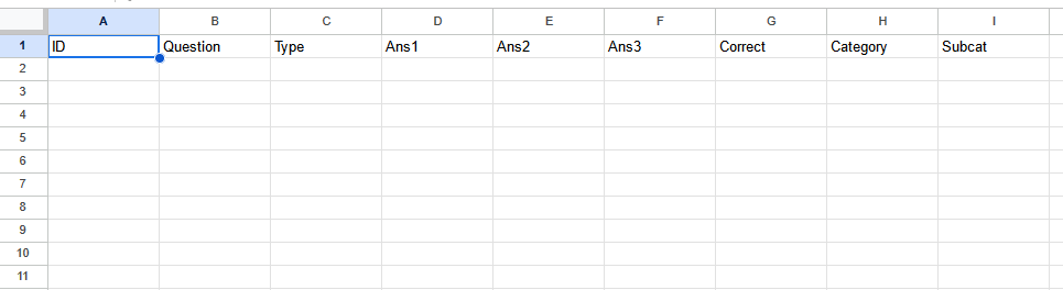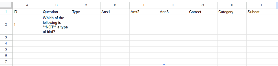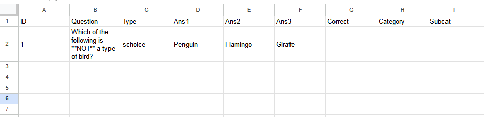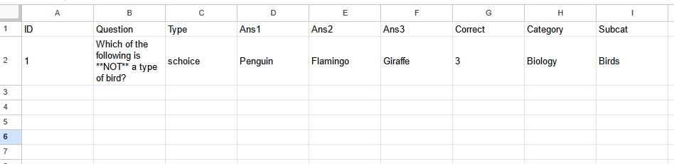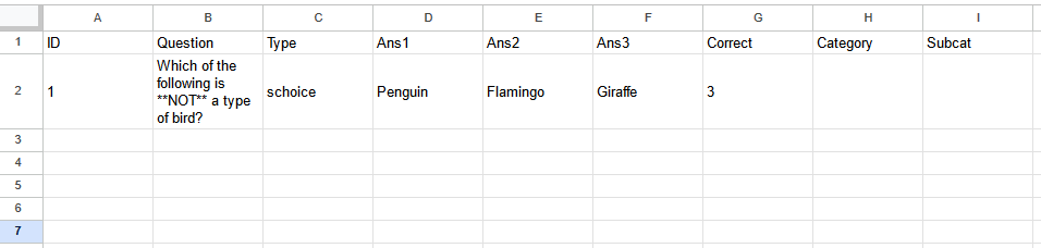 Any extra columns that do not match one of the names below will be added to the question’s metadata. This makes it easy to record searchable tags, warnings, or credits.