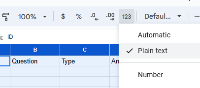 Then, set the entire Sheet to plain text. To do this, Press the button that says “123” (to the left of the font-selection box) and choose “Plain Text”.
