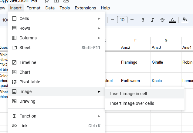 Select the cell in that column corresponding to the question you want to add an image to. Then, in the top menu, select “Insert” > “Image” > “Insert image in cell”.