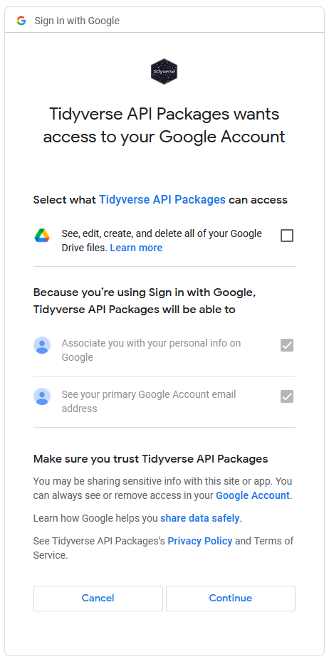 Check the box labeled “See, edit, create, and delete all of your Google Drive files.” and press the “Continue” button.