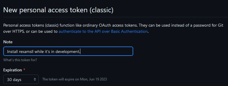 Start by providing a reason for this token’s creation in the “Note” section. You can also change the expiration date on the token, though the default value of 30 days works perfectly well.