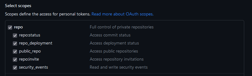 You should not need to change any of the selections in the “Select scopes” section. The “repo” section that is enabled by default should be all that you need to give R access to.